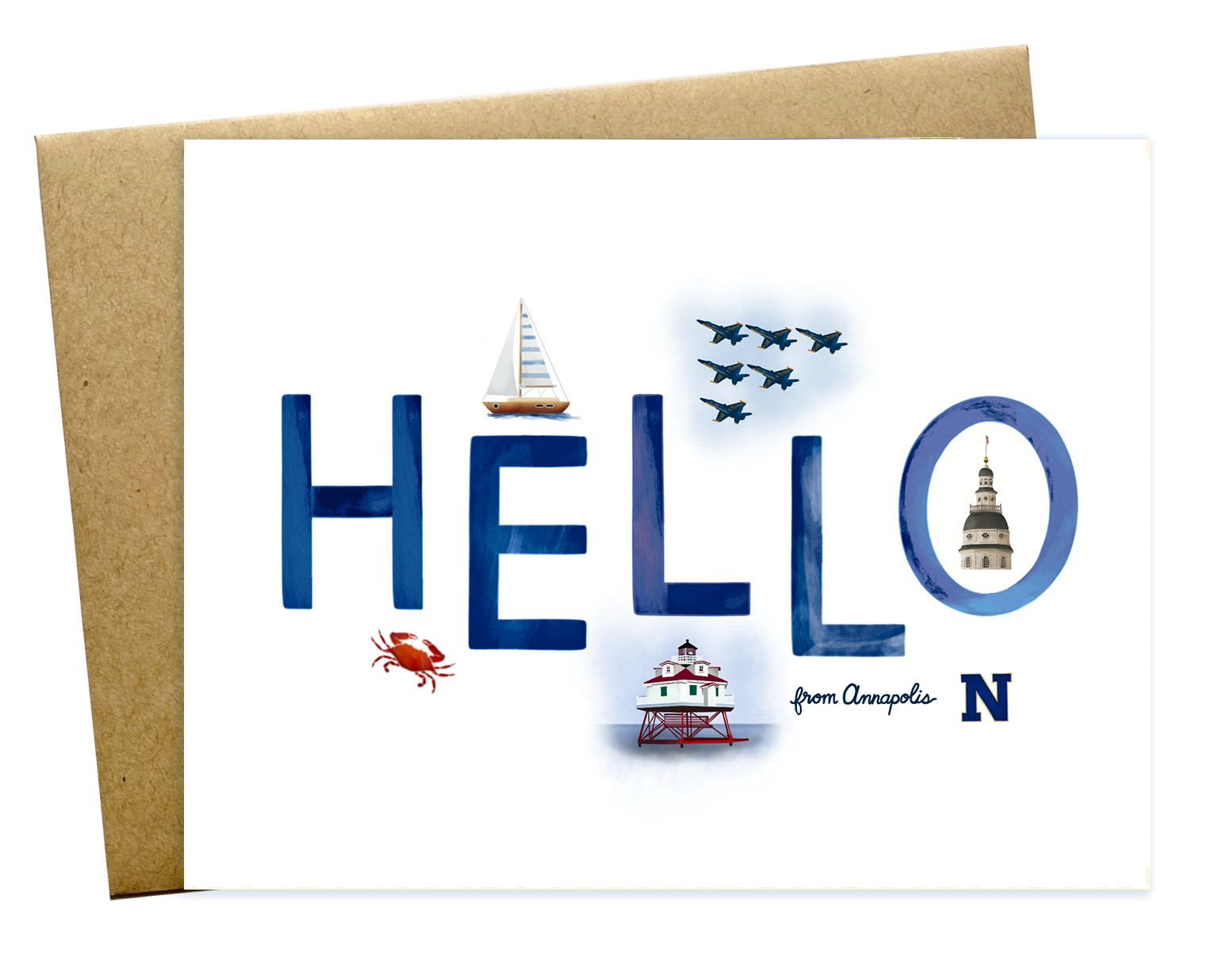 Say a great big Hello from Maryland's Capital, Annapolis, the home of Boating on the Chesapeake Bay, Blue Angel Flyovers, and cheering on Navy. Horizontally printed 5.5" x 4.25" with Kraft Envelope included.