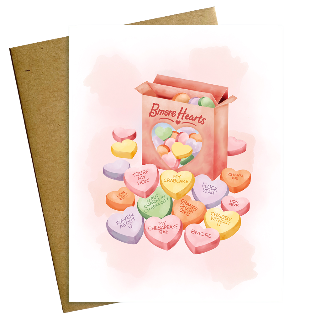 If Baltimore had its very own Conversation Heart Candy we think we know just what they would say. With expressions of love like "Raven About You", "Orange Crushin On You" and "My Chesapeake Bae", say Happy Valentine's Day the Charm City way! Vertically printed 4.25" x 5.5" with Kraft envelope included.