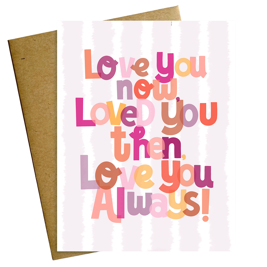 This is the kind of card you can send any time, for your true love, your Mom or your Dad, grandparents or your kids to let them know your love is forever, always has been and always will be. A heartfelt way to remind them they're cherished, now and always. Vertically printed 4.25" x 5.5" with Kraft envelope included.